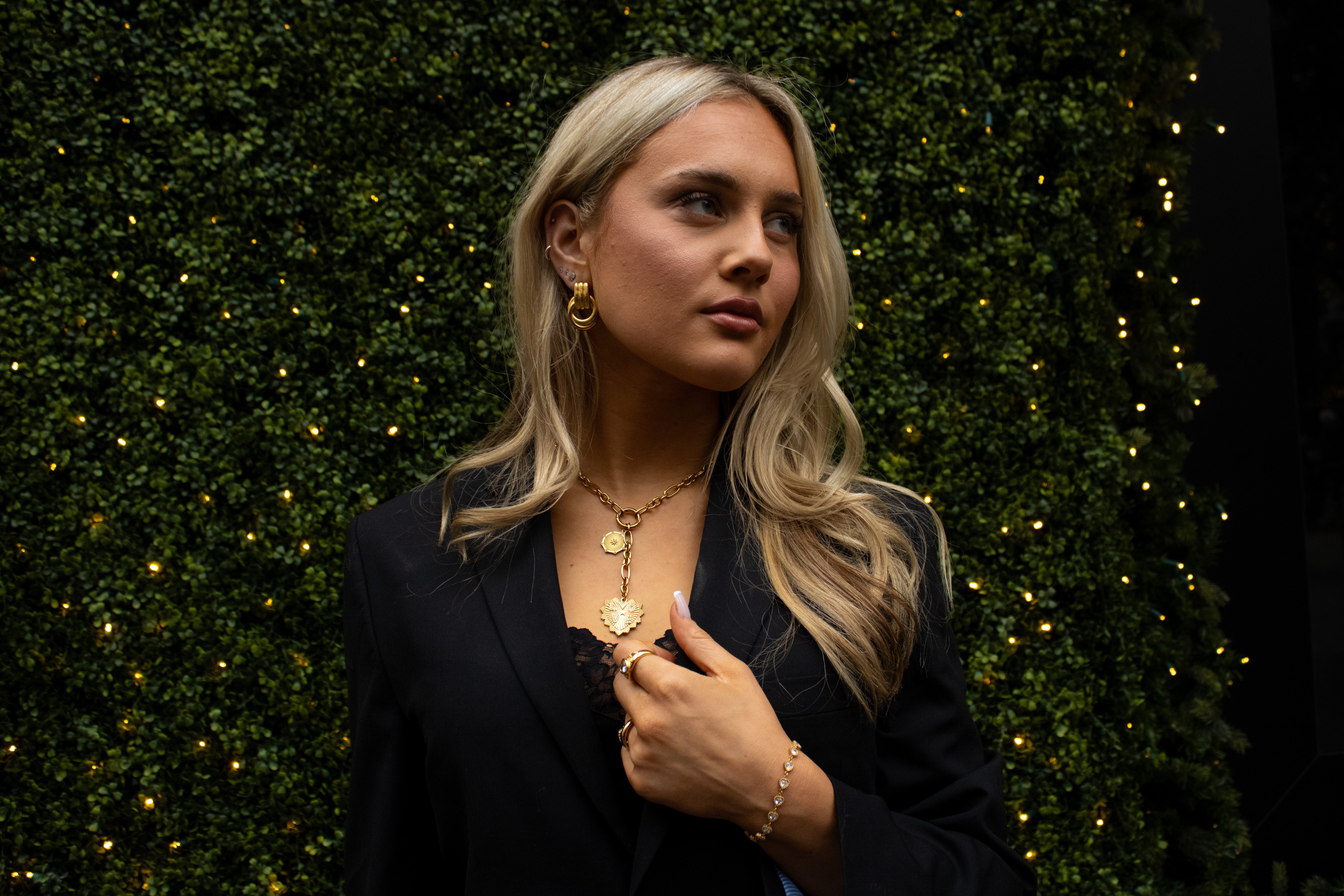 The Claudia Heart LOVE Pendant Necklace features a bold, textured gold heart pendant on a modern statement chain. Crafted from 18k gold-plated stainless steel, it’s hypoallergenic, tarnish-resistant, and designed for everyday wear. She’s stunning, truly a fashion-forward piece that elevates any look!