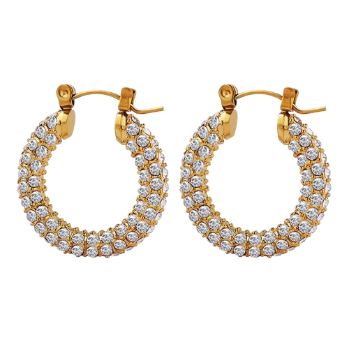 The Crystal Hoops Gold feature a full 360° layer of dazzling pavé-set cubic zirconia, giving these hoops nonstop sparkle from every angle. Made from premium stainless steel, they are hypoallergenic, tarnish resistant, and designed for long-lasting shine. Lightweight and eye-catching, these hoops elevate any outfit, from everyday looks to night-out glam.