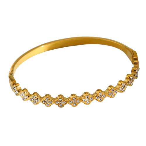 The Else Crystal Flower Bangle features a row of sparkling flower-shaped motifs set with high-quality cubic zirconia for a radiant, feminine finish. Crafted from premium stainless steel with an 18K gold coating, this bangle is hypoallergenic, waterproof, and tarnish resistant, making it a durable luxury piece you can wear every day. Its sleek hinge design ensures an easy, secure fit, while the shimmering floral details add effortless elegance to any stack.